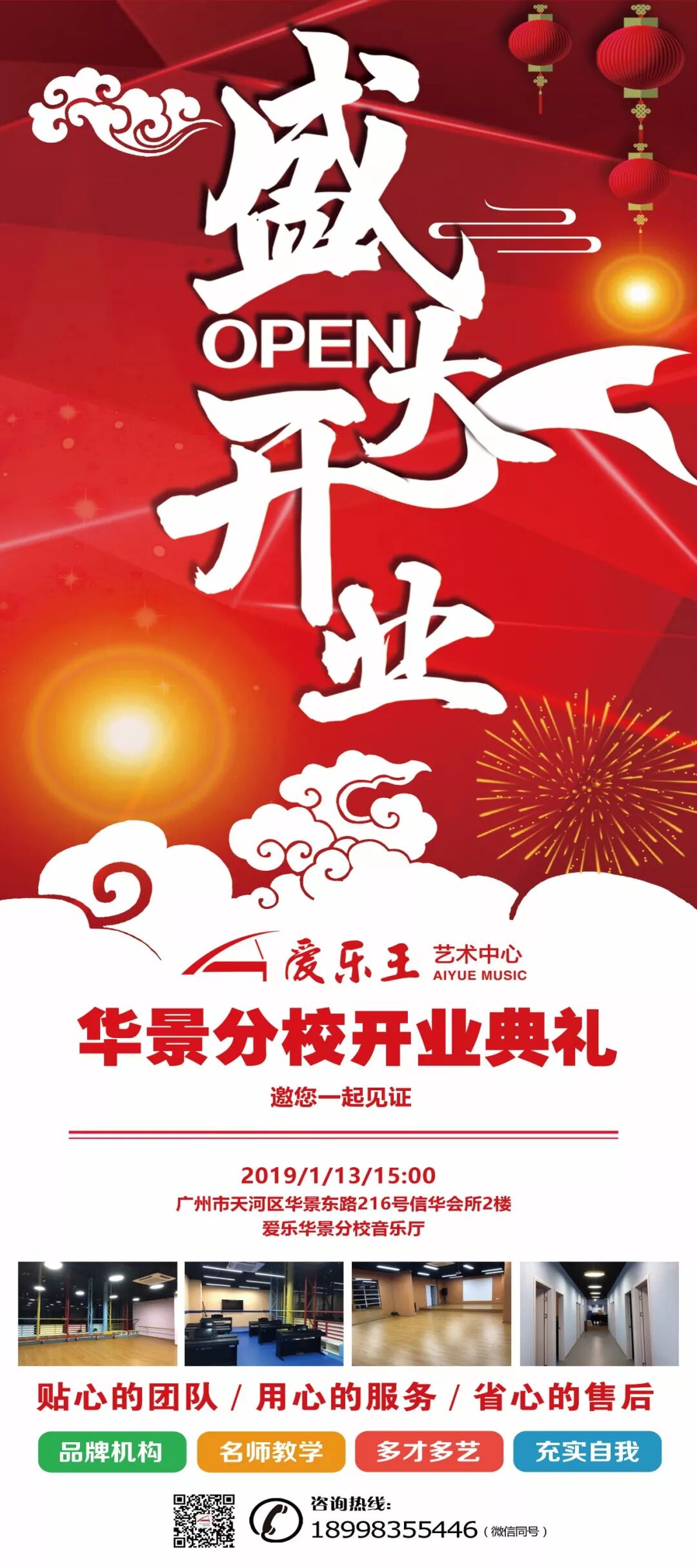 2019年1月13日,广州爱乐王艺术中心华景分校盛大开业。新校区位于广州市天河区华景东路216号,华景经理人会所二楼。校区环境优美、闹中带静,是学习艺术、培养兴趣爱好的好地方。广州爱乐拥有26年的办学经验、一直坚持“德育是首位、服务是基础、教学是中心、育人是根本”的育人理念,总结出独特的爱乐“三三七八十”教学法。寄予华景分校新校区的落成,能够继续传承经典、培养更多青少年,发扬“德艺双馨、欢乐人生”的核心理念。