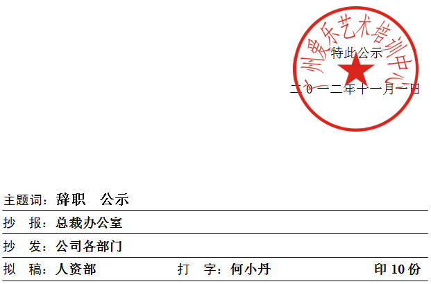 广州爱乐艺术培训中心执行副总裁卢丹同志由于个人客观原因选择离任,经研究同意卢丹同志辞去本职工作,已於2012年11月1日与公司办理工作交接,财务及其它离职手续,不再与公司有任何连带关系。